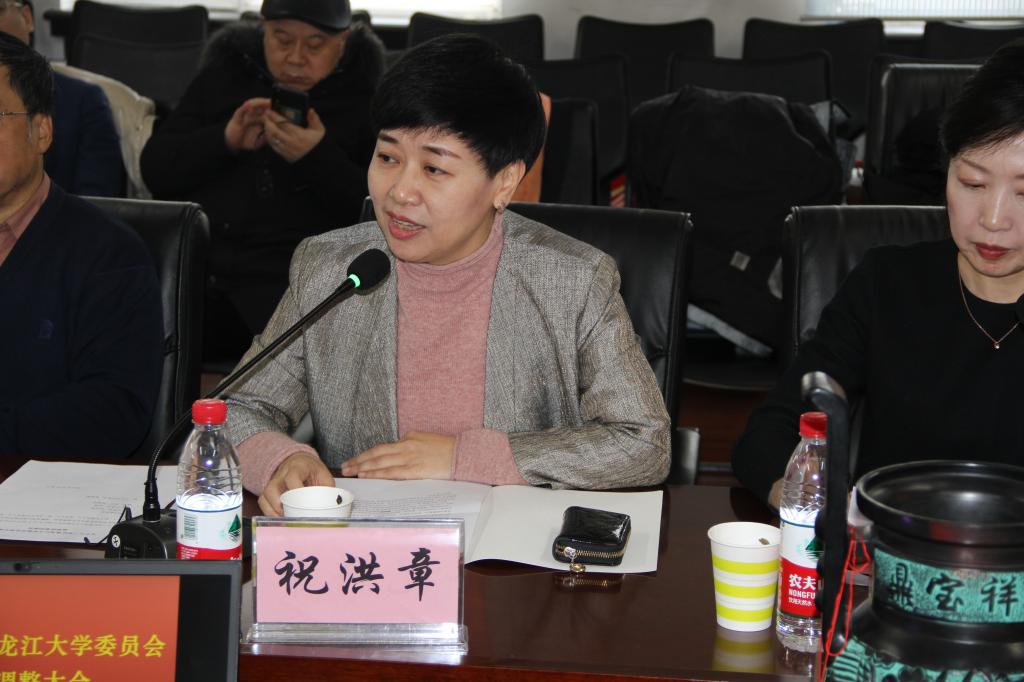 新任主委祝洪章代表调整后的新班子做表态发言,她表示将带领全体社员,传承九三学社爱国、民主、科学精神,接好九三黑大委员会发展的接力棒,积极探索委员会组织工作的新形式、新内容,更好的肩负起民主党派的时代责任和使命。