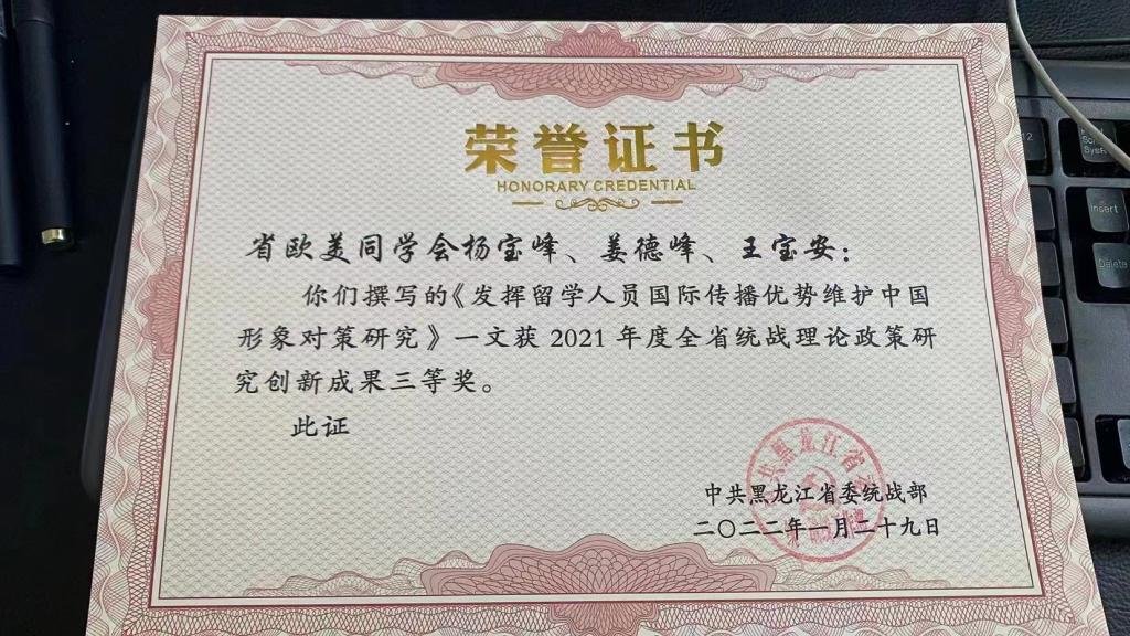 近日,由我校无党派人士、新闻传播学院姜德峰副教授作为主笔,省欧美同学会会长杨宝峰、秘书长王宝安共同撰写的《发挥留学人员国际传播优势维护中国形象对策研究》一文,在2021年度全省统战理论政策研究创新成果评选中取得优异成绩,荣获2021年度全省统战理论政策研究创新成果三等奖。