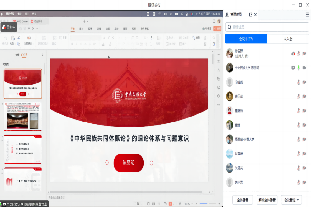 为深入贯彻落实习近平新时代中国特色社会主义思想进教材、进课堂、进头脑,巩固拓展主题教育成果,铸牢中华民族共同体意识,推进新时代党的民族工作高质量发展,11月30日,黑龙江大学党委统战部联合哲学学院、马克思主义学院以线上方式,开展《中华民族共同体概论》的理论体系与问题意识暨“中华民族共同体概论”课集体备课会。本次备课会邀请国家民委“中华民族共同体概论”教学示范团队成员,国家民委铸牢中华民族共同体意识宣讲团成员,中央民族大学民族学与社会学学院陈丽明博士主讲。备课会由党委常委、统战部部长王培军主持,马克思主义学院院长王秋,哲学学院教授、博士生导师、国家社科基金重大项目首席专家关健英及国家社科基金重大项目“中华民族共同体的伦理认同研究”课题组成员、“中华民族共同体概论”授课团队近40人参加活动。