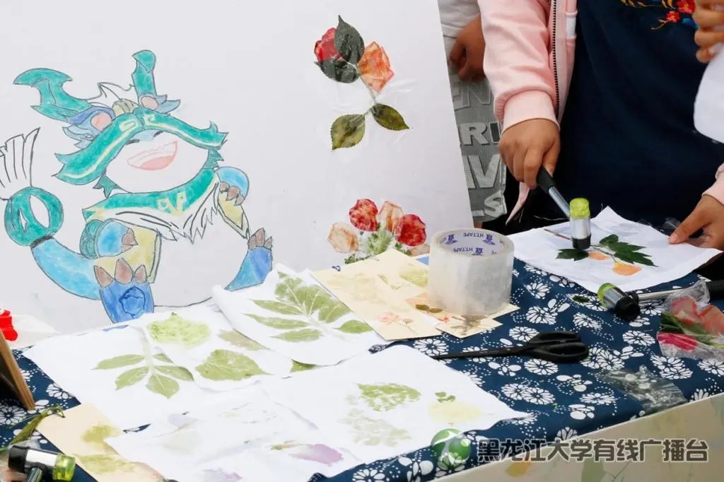 在“植物拓染”展位上,同学们搭配拼贴各色植物,通过敲打固色让自然之美拓印在书签、团扇、布包上。