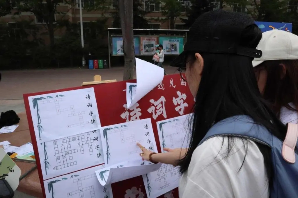 在“诗词字独、这厢有礼了”展位,同学们换上华服,认真地学习拱手礼和常见事物的雅称,并根据线索又快又准地填出了正确诗词。